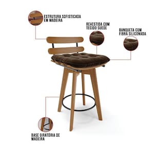 Banqueta Giratória Costela Suede Base Madeira Marrom