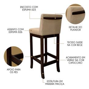 CARACTERÍSTICAS TÉCNICAS: - Produzido em Madeira Maciça; - Acabamento em Verniz na cor Capuccino; - Assento Preenchido com Espuma D26; - Encosto Preenchido com Espuma D23; - Revestimento em Tecido Suede na cor Bege.