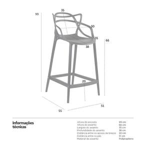 Material: Polipropileno - Altura do encosto: 99 cm - Altura do assento: 66 cm - Largura do assento: 35 cm - Profundidade do assento: 38 cm - Distância entre os apoios de braços: 50 cm - Distância entre os pés: 51 cm - Peso suportado: 120 kg - Garantia: 3 meses.