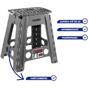 ESPECIFICAÇÃO TÉCNICA: - Material da banqueta: Polipropileno; - Capacidade de carga: 150 kgf; - Dimensões (fechada): Comprimento: 410 mm x Largura: 45 mm x Altura: 575 mm; - Dimensões (montada): Comprimento: 410 mm x Largura: 330 mm x Altura: 450 mm; - Cor da banqueta: Cinza; - Massa aproximada (peso): 1,83 kg.