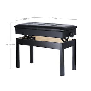 Banqueta para piano/teclado Assento acolchoado em couro sintético que não é apenas confortável, mas também extremamente elegante. O design vintage, irá complementar seus móveis e oferecerá uma sensação de luxo. Além disso, o banco possui uma estrutura de madeira sólida e pernas para uma ótima estabilidade e desempenho. Altura do banco de piano é 100% ajustável, de modo que cada membro da sua família pode usá-lo facilmente. Tudo o que você precisa fazer é girar os botões simples e ajustar a altura de 48 cm para 58 cm. Além disso, o produto conta com um espaço de armazenamento conveniente e escondido, sob o assento, que pode guardar suas partituras ou livros Dimensões Altura: 48 - 58 cm Assento: 72 - 34 cm Profundidade interior: 4,45 cm- Capacidade de pessoas: 2- Material: couro sintético e madeira maciça.- Assento: com 6 botões.- Cor: preto- Perfeito para escolas, igrejas, bares, orquestras, estúdios de gravação, bandas de música e concertos. Marca: Aj Som Acessórios Musicais