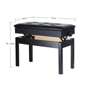 Banqueta para piano/teclado Assento acolchoado em material sintético que não é apenas confortável, mas também extremamente elegante. O design vintage, irá complementar seus móveis e oferecerá uma sensação de luxo. Além disso, o banco possui uma estrutura de madeira sólida e pernas para uma ótima estabilidade e desempenho. Altura do banco de piano é 100% ajustável, de modo que cada membro da sua família pode usá-lo facilmente. Tudo o que você precisa fazer é girar os botões simples e ajustar a altura de 48 cm para 58 cm. Além disso, o produto conta com um espaço de armazenamento conveniente e escondido, sob o assento, que pode guardar suas partituras ou livros Dimensões Altura: 48 - 58 cm Assento: 72 - 34 cm Profundidade interior: 4,45 cm - Capacidade de pessoas: 2 - Material: material sintético e madeira maciça. - Assento: com 6 botões. - Cor: preto - Perfeito para escolas, igrejas, bares, orquestras, estúdios de gravação, bandas de música e concertos. Marca: Não Informado
