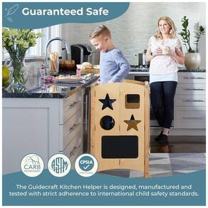 A banqueta torre de aprendizagem Guidecraft Classic Kitchen Helper é um banco auxiliar de bancada em madeira, dobrável e com altura ajustável, desenvolvido para crianças a partir de 18 meses. A estrutura compacta permite que a criança alcance a altura da bancada de cozinha com maior estabilidade, favorecendo a participação em atividades cotidianas sob supervisão de um adulto.