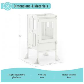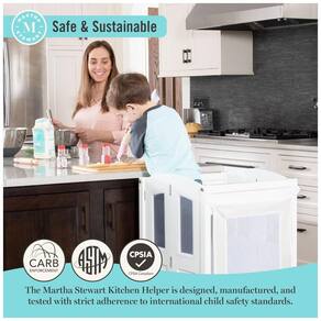 A banqueta torre de aprendizagem Martha Stewart Kitchen Helper Linen White é uma estrutura infantil em madeira, dobrável e com altura ajustável, desenvolvida para que crianças a partir de 18 meses alcancem a altura da bancada com mais segurança. O design em branco linho com laterais recortadas e janelas integra-se a cozinhas residenciais, permitindo que a criança participe de atividades de preparo de alimentos e outras tarefas sob supervisão de um adulto.?