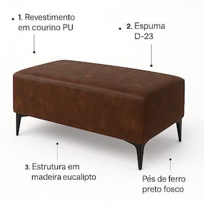 O Puff Vegas em courino marrom pinhão escuro transforma qualquer ambiente com seu visual marcante. Estrutura em madeira de eucalipto, pés de ferro e acabamento premium garantem durabilidade. Espumas D23 e D26 oferecem o conforto ideal para relaxar ou decorar com estilo.