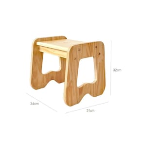 Altura 32 cm - Até o assento 30cm Comprimento 34 cm Profundidade 31 cm Peso Suportado 40 kg Material Madeira maciça de pinus de reflorestamento Acabamento Natural: Verniz Incolor Fosco - Mel e Nozes: Tinta Acabamento Necessita Montagem? Entregue desmontada, acompanha manual Ferramenta Necessárias Aompanha chave de montagem.