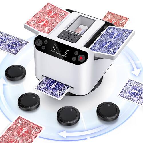 Com suporte para até 12 jogadores, este revendedor automático de cartas com rotação de 360° atende a reuniões maiores, garantindo uma experiência envolvente para jogos como Blackjack, Texas Hold'em, Bridge, skipbo, fase 10 e mais.