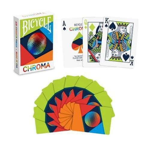 Concebidas de maneira criteriosa, as costas das cartas do modelo Chroma apresentam uma gama de cores extremamente vibrante, e formas das quais foram projetadas exclusivamente para criar floreios insanamente visuais. Você ficará vislumbrado quando for manipular essas cartas, com uma beleza única.