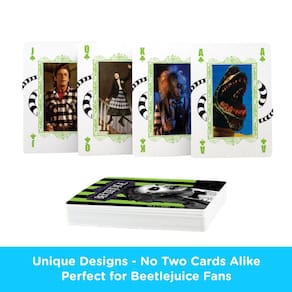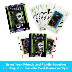 - BEETLEJUICE! BEETLEJUICE! BEETLEJUICE! Jogue seus jogos de cartas favoritos com amigos e familiares enquanto convoca o bioexorcista favorito de todos com este baralho oficial de cartas Beetlejuice