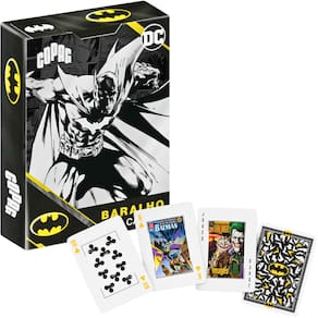 Descrição do produto : " O Baralho Batman é a escolha ideal para encantar fãs e colecionadores, trazendo em cada carta o universo do Cavaleiro das Trevas. Com capas de HQs icônicas que marcaram a história do herói, este baralho é uma verdadeira obra-prima visual. Produzido com cartão de qualidade de cassino e acabamento premium, oferece durabilidade e excelente desempenho nas partidas. Perfeito tanto para jogos como para enriquecer qualquer coleção, o Baralho Batman é um item indispensável para quem deseja celebrar o legado do maior detetive do mundo. Contém 55 Cartas : "