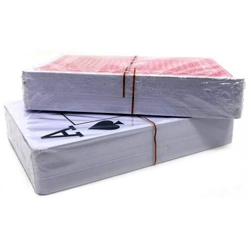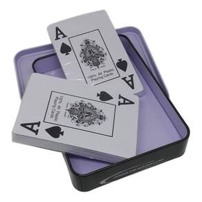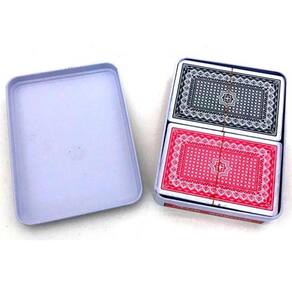 Descrição 02 baralhos com 54 cartas - total 108 cartas Embalagem em lata para armazenamento Medida aproximada da caixa de lata: - altura: 2,5 cm - largura: 9,5 cm - profundidade: 12,5 cm