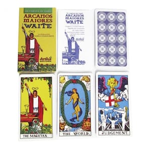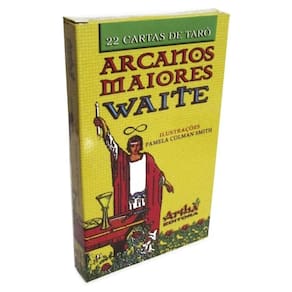 Contém manual resumido e 22 arcanos maiores do Tarô de Waite, plastificados, com ilustrações e colorido autêntico de Pamela Colman Smith.