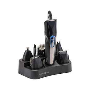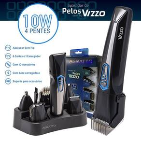 - Com 10 acessórios: 5 ponteiras de corte, 1 regulador de corte, 1 base carregadora, 1 carregador, 1 pente duplo e óleo lubrificante;