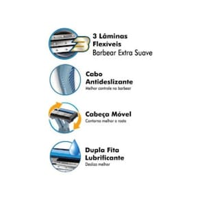 Contém cabeça móvel para facilitar o barbear, fita lubrificante com agentes suavizantes e cabo antiderrapante.