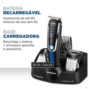 Aparador de Pelos Super Groom 10 BG-03 Bivolt: Potência, praticidade e função 10 em 1 para cabelo, barba, bigode e pêlos; lâminas de inox, bateria recarregável de 90 minutos, base carregadora, 4 pentes de corte com 16 níveis de altura. O Aparador de Pelos é 10 EM 1 e pode ser utilizado como aparador de cabelo, de barba e bigode, pentes de corte, pente ajustável, aparador para nariz e orelha, aparador de precisão e microbarbeador. O BG03 possui lâminas de inox: oferece maior durabilidade e alto desempenho para um corte rente e preciso. Seus pentes de corte possuem as opções: 4 pentes guia com 3, 6, 9 e 12mm de altura, e ainda um pente ajustável com 16 níveis de altura para uso no Aparador de barba. O BG 03 acompanha base carregadora que recarrega o aparador diretamente na base, e sua bateria de litium é recarregável com 90 minutos de uso sem fio, tendo luz indicadora de bateria que indica o nível para carregamento. 1 ano de garantia.