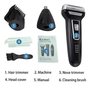Barbeador Elétrico 3 em 1 - Portátil e Confiável Máquina Kemei, deixa a pele lisa como se tivesse lâmina de barbear. Com 3 funções, barbear, cortar cabelo e aparar pelos do nariz, essa e a melhor opção do mercado. Principais Utilizações: Barbear Cortar Cabelo Acabamento Depilador íntimo masculino Depilador íntimo feminino Braços Pernas Costas Pelos do nariz Recomendações.: A cabeça shaver não causa irritação Ideal para pessoas que tenham alergia a lâmina e giletes Usar a lâmina de barbear após abaixar os pelos com a lâmina de corte. Para fazer a troca das cabeças do barbeador, girar a cabeça no sentido ANTI-HORÁRIO , e para encaixá-lo novamente girando no sentido HORÁRIO . Mantenha as lâminas lubrificadas Melhor opção para uso diário. Deixa a pele bem lisa. CARACTERÍSTICAS 3 em 1 Bivolt 110/220 v Frequência 50/60Hz Bateria recarregável Alta precisão 8 horas para carregar 60 min utilização sem fio ITENS INCLUSOS 1 Máquina Kemei 1 Cabeça de lâmina Corte 1 Cabeça de lâmina Barbeiro 1 Cabeça de lâmina nariz 1 Manual 1 Cabo carregador 1 Pente para limpeza 1 Óleo lubrificante do vendedor: 7 dias Marca: Não Informado Ean: 7895688647301