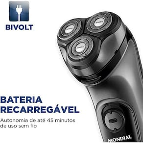 O barbeador elétrico power shave mondial bivolt be-02, conta com 3 lâminas duplas de inox, para um corte rápido, preciso e suave, deixando sua pele lisa e sem cortes. Além do aparador retrátil de costeleta, que apara facilmente costeletas e barbas mais longas. Sua bateria é recarregável e em um carregamento rápido que garante dias de uso.