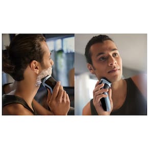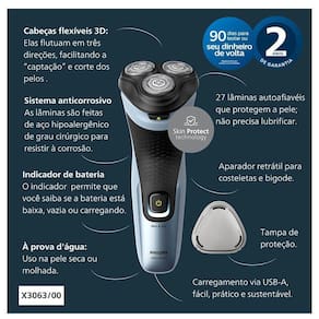 O barbeador Philips 3000X oferece um barbear rápido e confortável. As 27 lâminas autoafiáveis para uso seco ou molhado e o aparador retrátil tornam o barbeador fácil de usar e proporcionam umexcelente resultado. Possui 2 anos de garantia e 90 dias para testar. Lâminas ComfortCut As 27 lâminas autoafiáveis cortam confortavelmente os pelos bem rente à pele, proporcionando acabamento suave e uniforme, sempre. As lâminas autoafiáveis permanecem novas por 2 anos. Barbear a seco e com a pele molhada Escolha entre um prático barbear a seco ou um refrescante barbear úmido com gel ou espuma, até mesmo debaixo do chuveiro. Cabeças flexíveis 4D As cabeças flutuantes movem-se em quatro direções para manter um contato uniforme com a pele, impedindo fisgadas e cortes. Sistema de corte anticorrosão As lâminas do barbeador são feitas de aço cirúrgico hipoalergênico para resistir à corrosão, evitar impurezas e proteger sua pele. Aparador retrátil Refine e defina o bigode e as costeletas com o aparador retrátil e complete seu visual com facilidade. 45 minutos de barbear sem fio Em apenas uma hora, a bateria durável NiMH fica totalmente carregada para você se barbear por 15 vezes. Abertura com um único toque Para abrir a cabeça do barbeador e lavá-la em água corrente, basta tocar em um botão. Empunhadura de borracha Nunca perca a sua pega. O cabo ergonômico em borracha proporciona conforto e segurança, mesmo quando molhado. Indicador de carga da bateria Não seja pego de surpresa por uma bateria vazia. O indicador da bateria permite que você saiba se a bateria está fraca, vazia ou sendo carregada. Carga rápido de 5 minutos Está com pressa? Carregue o barbeador por apenas cinco minutos e obtenha energia suficiente para um barbear completo Carregamento USB-A Na Philips, impulsionamos a sustentabilidade em todos os aspectos da criação de produtos. Nossa ambição é diminuir o desperdício e reduzir o número de adaptadores USB que colocamos no mercado. Características Uso: Uso Molhado Tipo: Barbeadores Velocidades: 01 Quantidade de Lâmina/Pente: Tampa de proteção Aparador retrátil incluídoLâminas Hipoalergênicas Remove os Pelos pela Raiz Portátil Lavável Indicador de Carga Sistema Giratório Recarregável Uso/Operação: sem Fio Modelo: X3063/00 Voltagem: Bivolt Cor: Azul-celeste EAN: 8720689024587 Garantia: 24 meses Dimensões e Peso Dimensões do produto sem embalagem (AxLxP): 190x100x80 mm Dimensões do produto com embalagem (AxLxP): 205x169x209 mm Peso do produto sem embalagem: 0,32 Kg Peso do produto com embalagem: 0,42 Kg Itens Inclusos 01 Barbeador 01 Tampa de proteção Aparador retrátil incluído