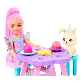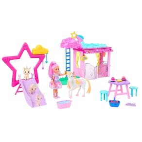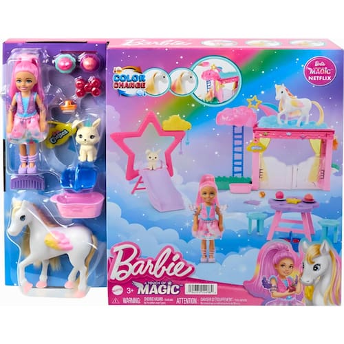 Este conjunto de Barbie A Touch of Magic inclui Chelsea e pegasus bebê com crina que muda de cor! O conjunto mágico oferece várias áreas de brincadeira, como estábulo e escorregador, além de coelhinho de estimação e acessórios coloridos. As crianças podem reproduzir as cenas favoritas do desenho ou criar suas próprias histórias incríveis! A boneca não fica em pé sozinha. As cores e as decorações podem variar.