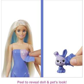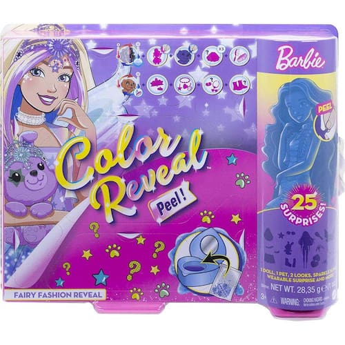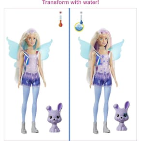 Bonecas Barbie Color Reveal oferecem a melhor experiência de unboxing -- este conjunto conta com 25 surpresas, incluindo 4 características de mudança de cor repetidas, um coelhinho de estimação, duas roupas de fada da moda fantasia, glitter e lodo em um compacto em forma de coração, uma boneca Barbie, uma pulseira de charme do tamanho de uma criança com dois encantos e um adesivo! Jogar fora transformações de moda fantasia uma e outra vez. A embalagem também faz parte da diversão. Um dos sacos surpresa contém uma misteriosa boneca Color Reveal parcialmente coberta de revestimento azul peelable. As crianças descascam para revelar a boneca, depois abrem as bolsas surpresa para descobrir roupas e acessórios para dois looks completos inspirados em fadas! E as surpresas continuam... descascar para revelar o coelhinho de estimação, também! Mergulhe a esponja em forma de estrela em água gelada para ativar as características de mudança de cor - como no rosto da boneca, corpete e cabelo! A mudança de cor no rosto do animal de estimação aumenta a diversão surpresa! Com o uso de água quente e gelada, as crianças podem repetir os momentos de mudança de cor wow uma e outra vez! Com tantas surpresas e peças, as crianças terão tantas histórias para contar. Qual boneca você vai revelar? As crianças podem colecioná-las para misturar e combinar acessórios e expandir as possibilidades de contar histórias! Cada um vendido separadamente, sujeito à disponibilidade. A boneca não pode ficar sozinha. Cores e decorações podem variar.