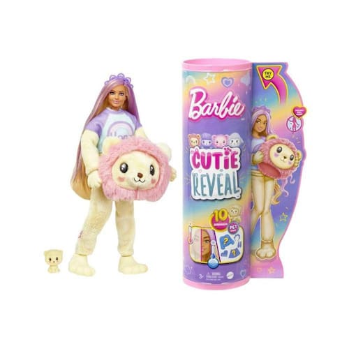 As bonecas Barbie Cutie Reveal Cozy Cute Tees oferecem a mais fofa experiência de unboxing com 10 surpresas Encontre um Leão acanhado vestindo uma camiseta costurada com a palavra Hope Esperança . Remova a fantasia de pelúcia para revelar uma boneca articulada Barbie com cabelo comprido e colorido. Fique mais confortável e descubra ainda mais surpresas, como uma tiara, saia de cetim e minibichinho de estimação combinando. Depois, vire do avesso a parte superior da pelúcia para transformá-la em um casaco de lã e vire a cabeça da fantasia para revelar uma caminha para o bichinho de estimação A água gelada adiciona ainda mais fofura com mudanças de cor no cabelo da boneca e no minibichinho de estimação, a água morna reinicia a transformação para mais diversão