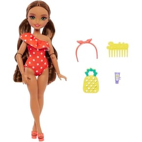 Contém: 1 boneca Barbie Dream Besties vestindo roupas de banho e sandálias removíveis, 1 bolsa de frutas, 1 protetor solar, 1 pente e 1 outro acessório.