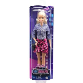 A boneca Barbie usa uma jaqueta inspirada em jeans e uma saia estilosa com estampa estrelada e detalhes em babados. Sapatos casuais brancos são perfeitos para explorar a cidade, e uma bolsa preta estilosa completa seu visual moderno. Crianças de 3 anos ou mais vão adorar sonhar com suas próprias grandes aventuras com bonecas e brinquedos Barbie Cada um é vendido separadamente, sujeito à disponibilidade. Cores e decorações podem variar.