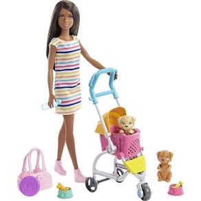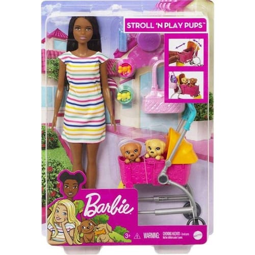 Divirta-se com o dia perfeito para brincar com cachorrinhos com o conjunto Barbie Stroll n Play Pups que inclui uma boneca Barbie, dois cachorrinhos de estimação, um carrinho transformador e acessórios para contar histórias!