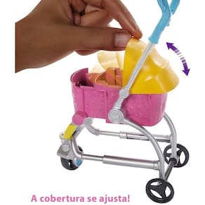 Existem duas formas de viajar: acomodar um cachorrinho no carrinho e outro na bolsa da boneca Barbie; ou puxe a frente do carrinho para fora, dobrando seu espaço para dar lugar aos dois cachorrinhos!