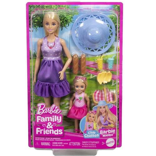 As bonecas Barbie "Malibu" e a irmãzinha Chelsea estão saindo para um piquenique, e as crianças têm todas as peças para representar o momento clássico. Nove peças temáticas incluem acessórios de moda, uma cesta, alimentos, bebidas e um cobertor!
