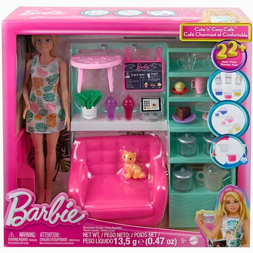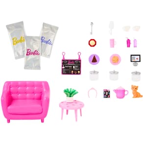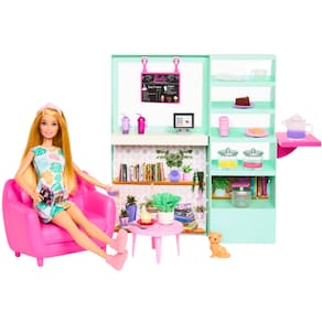 Desfrute de um momento relaxante no Cute n Cozy Café com este conjunto de Barbie e loja! Decore o balcão e as prateleiras com acessórios, pegue uma guloseima e, em seguida, finja preparar uma "infusão de ervas" no bule que muda de cor. Com 21 peças para contar histórias, incluindo um gatinho de estimação, este conjunto encantador vai render horas de diversão sem fim! A boneca não fica em pé sozinha. As cores e as decorações podem variar. Não coma nem beba o conteúdo.