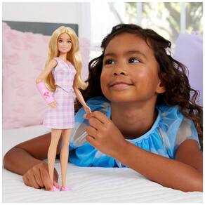A Barbie Fashionistas Doll #243 (modelo JJN56) traz uma boneca loira de pele clara com braço direito engessado em rosa, representando situações do dia a dia com diversidade de experiências físicas. A linha Fashionistas é pensada para refletir diferentes estilos, corpos e acessórios, incentivando narrativas mais realistas no brincar.