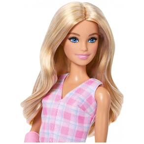 Ela usa o cabelo loiro solto, levemente ondulado, em comprimento abaixo dos ombros, pronto para ser penteado e estilizado. O visual é composto por blusa xadrez e saia xadrez coordenadas, formando um conjunto em tons modernos, combinado com mocassins rosa nos pés. O gesso rosa tem desenhos como coração e a assinatura “Barbie”, funcionando como acessório visual e elemento de história (acidente, recuperação, etc.).