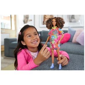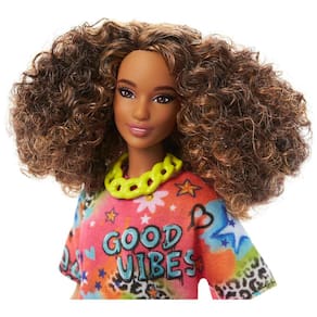 A boneca possui cabelo castanho claro em cachos volumosos, permitindo variação de penteados e manipulação durante a brincadeira. O visual é composto por vestido tipo camiseta com estampa em estilo grafite, com motivo frontal “Good Vibes” e padrões gráficos mistos, alinhados a referências de moda esportiva urbana.
