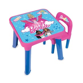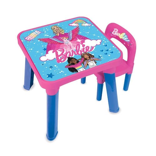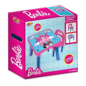 Com cores vibrantes e elementos icônicos da Barbie, o design da mesa e da cadeira cativa as crianças, tornando a hora das atividades ainda mais divertida.