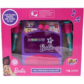 Barbie Meu Primeiro Karaokê. Plugue o celular, tablet, bluetooth ou computador e arrase. Com ele você pode cantar sua música favorita, apenas conectando seu smartphone ou mp3 player. Também é possível cantar junto, conectando seu aparelho. Solte a voz e mostre todo seu talento para os amiguinhos e a família. Vem com 2 microfones, 1 alto-falante amplificador com efeito de luzes, 2 cabos extras longos e 2 suportes de fixação para microfones.