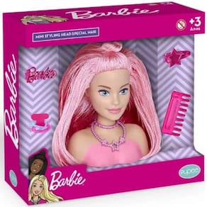 A última linha de bonecas Barbie Mini Styling Head Special Hair inclui 01 Boneca Barbie, 01 Pente para Cabelo, 01 Presilha Estrela, 01 Presilha Logo Barbie e 10 Elásticos de Silicone.