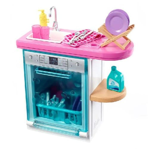 Barbie Sortimento Móveis Básicos vem com uma mobília interna e externa que ajudam a criar cenas para um dia perfeito com temas divertidos - como uma casinha de cachorro, uma sala de estar, uma lava-louças, uma boia de donuts, um forno de tijolos e uma mesa de piquenique, (vendidos separadamente).