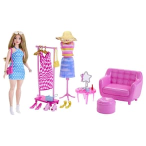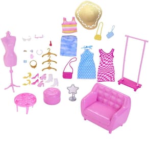A Barbie está pronta para encher o closet dos seus sonhos com este fabuloso conjunto que conta com roupas, móveis e acessórios. Com tantas peças da moda, há inúmeras horas de diversão pela frente! Misture e combine roupas com bolsas e joias, depois relaxe na mobília do lounge cor-de-rosa. É o conjunto de roupas perfeito para uma criança com estilo!