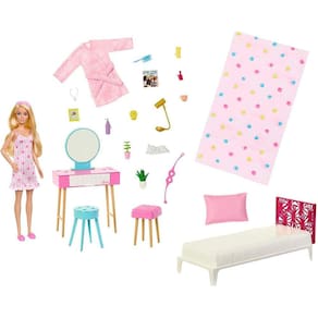 A Barbie está muito confortável neste conjunto de quarto Com cama, mesinha de cabeceira, penteadeira e muitos acessórios temáticos, as crianças podem brincar com a rotina da manhã e da hora de dormir ou inventar suas próprias histórias criativas. Detalhes, como um gatinho sonolento e um roupão macio, adicionam ainda mais charme ao conjunto. A boneca não fica em pé sozinha.A Barbie vem com um gatinho sonolento e 20 peças coloridas com tema de quarto.CaracterísticasMarca: MattelRef: HPT55Idade: 3+ anosMaterial: PlásticoAltura da boneca: aproximadamente 27cmImagens Meramente IlustrativasHomologação Inmetro: IP-BRI-0200/2022-02