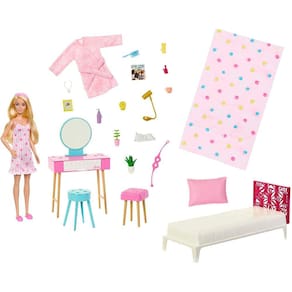 A Barbie está muito confortável neste conjunto de quarto! Com cama, mesinha de cabeceira, penteadeira e muitos acessórios temáticos, as crianças podem brincar com a rotina da manhã e da hora de dormir ou inventar suas próprias histórias criativas. Detalhes, como um gatinho sonolento e um roupão macio, adicionam ainda mais charme ao conjunto. A boneca não fica em pé sozinha.