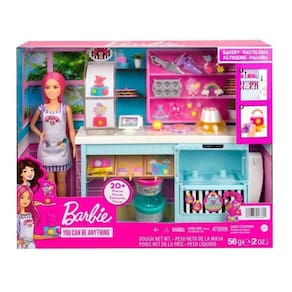 As crianças podem administrar uma padaria e decorar bolos com o Barbie bakery playset Ostentando uma forma pequena, cabelo rosa e vestindo um lindo vestido listrado com blusa, a boneca Barbie está pronta para assar bolos e decorá-los também playset inclui estação de padaria, boneca Barbie de 12 polegadas, 2 recipientes de massa, carimbo de saco de confeitar, espátula, decorações, toppers, forma de cupcake, prato de biscoito e muito mais para criar bolos realistas, as crianças podem usar dois tipos de massa rosa ou azul e colocar no forno, puxar a alavanca e ver os bolos crescerem para se divertir Em seguida, a diversão de decoração do bolo começa quando as crianças colocam o bolo assado no suporte do bolo e adicionam decorações e toppers algumas das peças de contar histórias têm um recurso de encaixe que permite que a boneca Barbie segure o item para uma brincadeira realista
