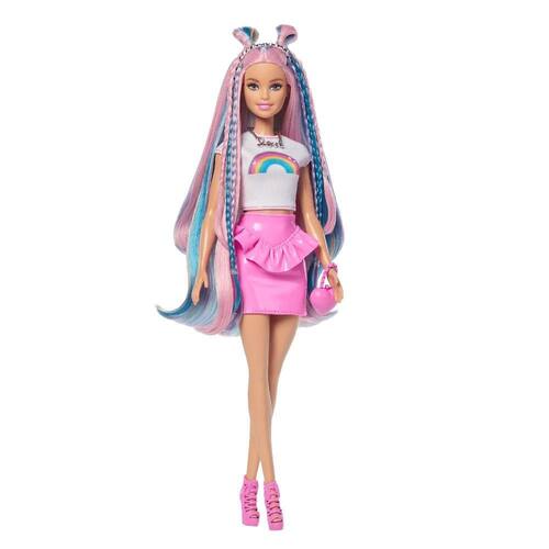 A boneca Barbie Rainbow Sparkle Hair vem com acessórios estilosos para criar diversos penteados, incluindo presilhas, elásticos, tiara, chapinha, secador, escova, spray, colar e bolsa.