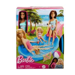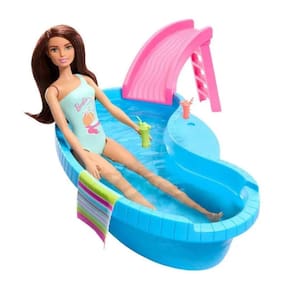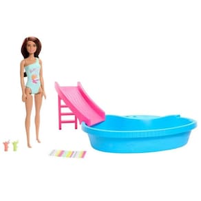 Divirta-se com estilo com a Barbie Piscina com Boneca Maiô Verde Você pode mergulhar na diversão de verão com a boneca Barbie e sua piscina É fácil de encher e esvaziar, para uma festa na piscina. Ajude a Barbie a subir a escada e descer pelo escorregador, depois relaxe na água com uma bebida refrescante Viva momentos incríveis com Barbie e suas amigas neste cenário colorido e cheio de diversão.
