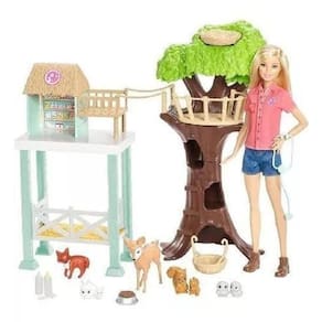 A boneca Barbie® ama animais, então ela está montando um centro de resgate -- onde eles vivem para cuidar deles! Com oito pacientes animais, este conjunto de boneca Barbie® e centro de resgate florestal permite que jovens amantes de animais resgatem animais. Há um filhote de veado, uma raposa, dois esquilos, dois coelhos e duas corujas. Projetado com um cenário natural, o colorido posto de cuidados (com dois níveis) é conectado a uma árvore por uma ponte de corda que funciona com a cesta de transporte de animais. A árvore apresenta muitos lugares para os animais menores descansarem, como o ninho em cima das folhas, buracos no tronco e uma plataforma entre os galhos. O posto de cuidados da boneca médica animal Barbie® combina com a árvore em dois andares de altura com elementos divertidos como um telhado de palha com o logotipo da Barbie® no topo, cores e decalques legais por toda parte e uma cama para animais abaixo. A boneca Barbie® está pronta para atender os pacientes vestindo uma camisa de colarinho, shorts jeans e botas. Um estetoscópio, duas mamadeiras e uma tigela de alimentação a ajudarão a cuidar dos animais. As imaginações jovens vão adorar realizar suas aspirações com este centro de resgate de animais porque com a Barbie®, você pode ser qualquer coisa! Inclui a boneca Barbie® usando roupas e acessórios, estação de cuidados, árvore, oito animais e acessórios. A boneca não fica em pé sozinha. As cores e decorações podem variar.