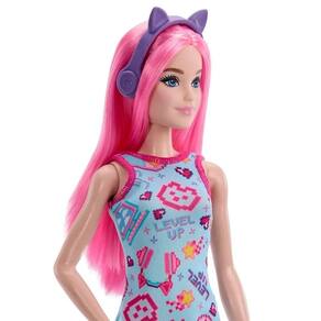 O vestido colorido com estampa temática gamer traz toda a energia do universo digital, enquanto os acessórios, como o fone de ouvido com orelhas de gato e o controle de videogame rosa, deixam a brincadeira ainda mais imersiva. Com roupas e sapatos removíveis, a Barbie permite diferentes combinações, incentivando a expressão e a imaginação.