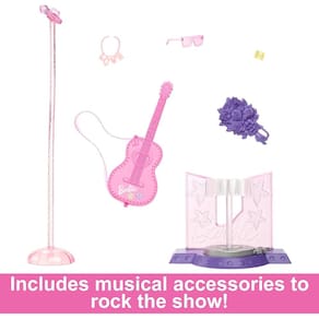 Boneca Barbie Pop Star com vestido deslumbrante e violão, pronta para brilhar s palcos e conquistar o público Articulações múltiplas s ombros, cotovelos, pulsos, quadril e joelhos para poses incríveis durante as apresentações Ideal para crianças a partir de 3 as, estimula a criatividade e o desenvolvimento do talento musica