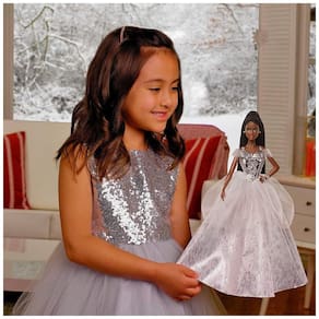 A Barbie Signature 2021 Holiday versão morena com tranças é uma boneca colecionável temática de fim de ano, desenvolvida para representação de cenas festivas e exposição em vitrines ou prateleiras. O modelo utiliza corpo do tipo Model Muse, indicado para poses estáticas, com silhueta desenhada para vestidos longos e composições de moda.