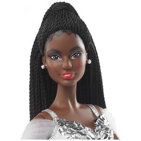 Conteúdo da caixa: 1 boneca 2021 Holiday Barbie brunette braided hair, 1 par de sapatos, 1 vestido longo prateado, 1 base expositora, 1 Certificado de Autenticidade