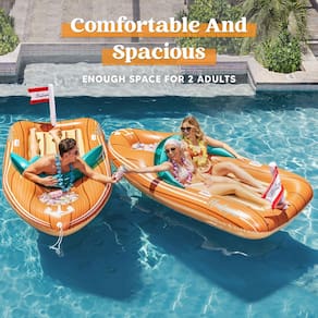- PACOTE SUPER ECONÔMICO. Lounge de festas gigante flutuante para duas pessoas, ele pode suportar até 250 libras. Mais de 8 pés de comprimento com refrigerador reforçado, 2 alças e 1 ponto de reboque. O pára-brisa funciona como um apoio de cabeça confortável.